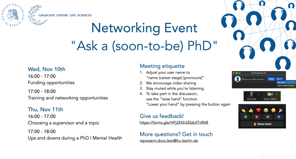 - 2021-11-10: “Ask a (soon-to-be) PhD” Networking Event, Humboldt University Graduate Centre Life Sciences